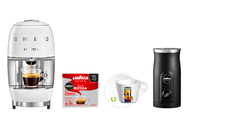 Your complete spring coffee setup with A Modo Mio Smeg machine, frother, capsules and cappuccino cups.